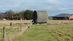 A section of reinforced concrete pipe manufactured for the RDR scheme was retained and installed at a site in Methven that was formerly the Public Works Department's headquarters and the workers' accommodation camp for the scheme. Approximately 800 of these pipe sections were installed to complete the RDR project. The pipe section is 3.65 m (12.0 ft) in diameter, and is mounted on a base that was a pre-cast control gate for the water race. Concrete ends were installed and a timber floor fitted to turn the pipe section into a storage space. The Pipe Shed has been used for various purposes including an explosives store.[18]