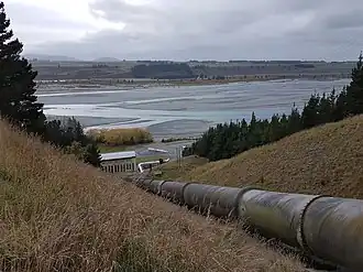 A short canal alongside the existing tailrace from Highbank Power Station is used to divert water from the Rakaia River into the intake of the pumping station. Pumps then pass the water via a pipeline into the existing power station penstock, so that it flows up and into the Rangitata Diversion Race. There are six pumps, each capable of delivering one m3 per second. Each pump is driven by a 1.55 MW electric motor. Technical features of this development include the large bifurcation or ‘tee’ that was required to connect the new pump station pipeline to the original power station penstock. Another feature is a large 40 m3 air chamber that is used to manage pressure variations during pump station operations. The pumping station was originally developed as a joint venture between Barrhill-Chertsey Irrigation and Electricity Ashburton, but the irrigation company took full ownership in 2017.[31][32]