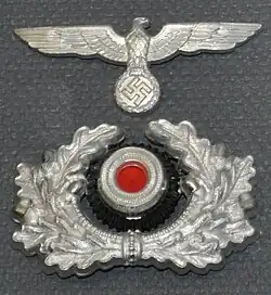 The Reichswehr's visual acknowledgement of the new National Socialist reality came on 17 February 1934, when the Commander-in-Chief, Werner von Blomberg, ordered the Nazi Party eagle-and-swastika, then Germany's National Emblem, to be worn on uniform blouses and headgear effective 1 May.[1] The design adopted, in silver for the Reichsheer (army) and in gold for the Reichsmarine (navy), was a stylized eagle with outstretched, beveled wings clutching a wreathed mobile swastika, later to be called the Wehrmachtsadler ("armed forces eagle").[a]