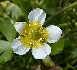Flowering occurs between May and September in Northern Europe. The flowers are borne singly on long pedicels arising opposite to a leaf (the pedicels are up to 10x as long as the corresponding petiole). The 5 petals are white with a yellow base, a lunate nectar pit, and are contiguous at anthesis. Each petal is about 1 cm long. There are also 5 sepals about half as long as the petals, which are greenish with dark markings, especially at the tip. The hermaphroditic flowers have 15-30 stamens and up to about 65 carpels.