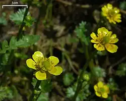 It is aquatic or semi-aquatic, growing in water or in or near muddy areas in many habitat types. It is a perennial herb that produces stems up to about 70 centimeters long that float in water or spread along wet ground, sometimes rooting where they come in contact with moist substrate. Leaves are variable in morphology; as in many types of aquatic plants, leaves that develop submerged in water look different from those that develop in air. This phenomenon, heterophylly, has been studied extensively in this species, and leaf morphology has been shown to be influenced by many environmental factors, including temperature[3] and the concentration of abscisic acid.[4] A number of other factors affect leaf shape in heterophyllous plants.[5] In this species, leaves that develop in the open air have somewhat rounded blades that are divided into a number of short, blunt, wide lobes. Leaves that develop underwater have narrow, even threadlike lobes. The inflorescence is made up of one or more flowers with five to fourteen, but generally no more than eight, shiny yellow petals. The petals, each up to 1.3 centimeters in length are arranged around a central nectary with many stamens and pistils. The fruit is an achene borne in a dense cluster.