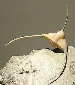 All raphiophorids are blind, with headshields (or cephalons) that are triangular to subcircular, and many carry long, trailing genal spines, a forward-directed rapier-like spine on the central raised area (or glabella), or both, with the glabella often inflated and the natural fracture lines (or sutures) of the cephalon coinciding with its margin. The thorax typically has five to seven segments[1] (except for the genera Taklamakania, Pseudampyxina, Nanshanaspis, and Kongqiangheia, which have only 3). As mentioned before, all raphiophorids are blind. Many, if not most, genera have no eyes whatsoever, though a few, such as Lehnertia, have vestigial tubercles that correspond to the compound eyes of their ancestors.