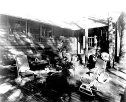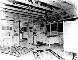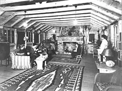 To design the cabins at Rapidan Camp, Lou Henry Hoover hired an architect who had built Girl Scout camps.[55] The facilities were rustic by modern standards. Some of the early structures such as the original Five Tents had just a wooden floor and 3-foot-high (0.91 m) walls, with canvas tents above.[15] Even the President's Cabin was built with single-wall uninsulated construction—slats of German Siding nailed to studs and exposed on both sides. There are no interior ceilings; rafters and roof boards are exposed. Shower stalls have tin walls and concrete floors. During Hoover's administration, cabin porches were decorated with boxes filled with geraniums, and interior floors were covered with grass rugs.[14] The camp was modified throughout Hoover's presidency with new cabins and additions to existing cabins.