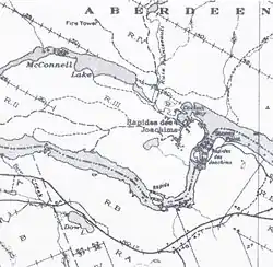 However, both in Quebec and in Ontario, the name Swisha, Sweshaw, or Shesha Rapids has also long been used for this location as a map of 1790 indicates. Swisha is an obvious distortion of the French pronunciation of "Joachim".[5]