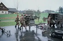 ![]() A Swiss Air Force Rapier SAM installation with the detached generator set sited approximately 20 metres from the launcher. Fuel is being supplied to the generator from one of the three jerrycans grouped adjacent to it (one in use and two spare). | |