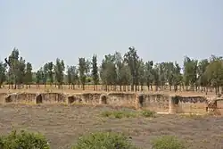 Only one palace building has been investigated by archeologists. It was built of mudbrick and went through multiple phases of construction and expansion. It was first constructed as a roughly square walled enclosure, measuring 55 by 55 meters, whose exterior was reinforced with round towers or buttresses. Buttressed walls like this were a feature of Roman castrum architecture and were also found in early Islamic architecture.[7] The building had a central rectangular courtyard surrounded by rooms, including a large reception room in the middle of the north side. Judging by its layout, this building may correspond to what historical sources refer to as the Qaṣr aṣ-Ṣaḥn ("Courtyard Palace").[7] The building was entered from the south via a bent entrance (a passage turning 90 degrees twice), a feature which became common in the Abbasid period as both a defensive measure and as a means to preserve the privacy of the inhabitants inside. The entrance led directly into the courtyard. A cistern existed under the center of the courtyard where rainwater was collected and stored for future use. The reception room to the north, roughly square in shape, was divided into three north-to-south naves by two rows of four columns. A small apse or semi-circular niche at the back of the hall probably marked the location of the emir's seat or throne.[7] This type of basilical columned hall became a recurring feature of palatial architecture in the western Islamic world.[9] In a later building phase, this palace enclosure was expanded to the north and west until it measured 105 by 105 meters. The additional space was filled with living quarters.[7] The interior underwent further reorganization later during the Fatimid and Zirid occupations of the site.[9]: 48–49