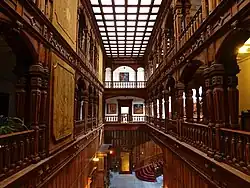 The Viceregal Lodge was designed by British architect Henry Irwin and built in the Jacobethan style during Lord Dufferin’s tenure as Viceroy. Its construction started in 1880 and was completed in 1888. Lord Dufferin occupied the lodge on 23 July 1888.[4] The final cost of project was around 38 lakh (3,800,000) rupees with the annual upkeep cost being around 1.5 lakh (150,000) rupees in the 1880s. At that time the estate stood on an area of 331 acres (134 ha), but today is reduced to 110 acres (45 ha). The structure draws inspiration from the architectural style of the English Renaissance, and also reflects elements of the castles of the Scottish Highlands. The building is of light blue-grey stone masonry with tiled pitch roofing. The interior of the main building is noted for elaborate woodwork which has stood the test of time. Teak was brought from Burma, and was supplemented by local cedar wood and walnut.[5]