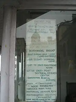 The Simla Conference convened by Lord Wavell in 1945 to approve the Wavell Plan for Indian Self Government was hosted at this estate.[6] The summer capital of India was of little use to the President of India who visited it only for a few days in the year, if at all. Professor S. Radhakrishnan thought of putting it to academic use. The Rashtrapati Niwas Estate was transferred to the Ministry of Education to be handed over to the Indian Institute of Advanced Study. The C.P.W.D., the Himachal Pradesh High Court, and the Himachal Pradesh University were allowed in due course to use some of its buildings but the bulk of the Estate, including its well kept lawns and rich greenhouse, has remained in use for the Indian Institute of Advanced Study.[7]