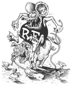 Rat Fink[1] is one of several hot rod characters created by American artist Ed "Big Daddy" Roth, one of the originators of Kustom Kulture of automobile enthusiasts.[2] Roth conceived of Rat Fink as an antithesis of Mickey Mouse. Rat Fink is usually portrayed as either green or gray, comically grotesque and depraved-looking with bulging, bloodshot eyes, an oversized mouth with sharp, narrow teeth, and wearing red overalls with the initials "R.F." on them. He is often seen driving cars or motorcycles.[3]