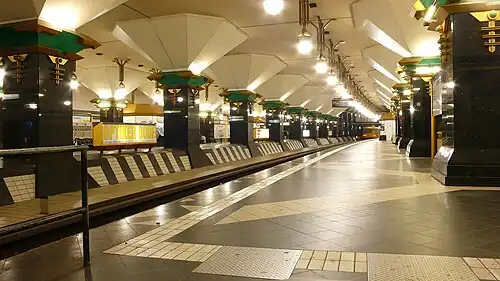 The station was built in a box under a cover in order to minimise the disturbance of surface traffic. With its two island platforms, the station, which was designed by Rainer G. Rümmler, has almost monumental dimensions. It has a big hall with high ceilings, much light and 64 lamps, columns with black granite and a parquet floor like floor. The southern end of its platforms are spanned by a gallery for the movement of passengers to the surface and from which the entire station can be seen. The U-Bahn station also includes a signal control centre for the line to Paulsternstraße.