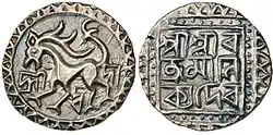 During 1464–1468 Ratna Manikya saw the influx of Bengali settlers began arriving in the region.[19] This migration facilitated cultural exchange while also increasing revenue and enhancing agricultural output. This Bengali influence was further felt in the currency, with Ratna being the first monarch to mint coins, mimicking the weight and fabric of those struck by the Sultans of Bengal, whilst also providing evidence of the religious conditions at the time.[20][21] Though the Rajmala references Ratna's devotion to the Hindu deities Vishnu and Narayana, this numismatic evidence also alludes to his worship of Shiva and Parvati through the titles and legends he employed. Other coins also mention his veneration of the Chaturdasha Devata (fourteen deities). All of this indicates that Ratna patronised all sects equally and, alongside records of his charitable deeds (Dāna), show his attempt to adhere to the ideal of a Hindu ruler as advised in the Puranas and Smriti. Historian Ramani Mohan Sarma concludes that, in reference to Tripuri society as a whole, this displayed "the final transformation of the Mongoloid (Bodo) pantheon of an important section of the Indo-Mongoloids into the orthodox Hindu pantheon of the Paranas".[22]