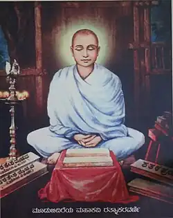 Ratnakaravarni of Mudabidri (c. 1557) was a court poet under the patronage of Bhairasa Wodeyar at Karkala, modern coastal Karnataka, and is famous for successfully integrating an element of worldly pleasure into asceticism and for treating the topic of erotics with discretion in a religious epic, his magnum opus, the Bharatesha Vaibhava.[4] One of the most popular poets of Kannada literature, his writings took to a fine line between the royal court and conservative monastery. His writings were popular across religions and sects for their secular appeal. In fact, an early 19th-century writing recognises him as an authority on erotics and the science of pleasure, rather than a poet with a spiritual bent.[5] A radical and sensitive poet, he once claimed that spiritual meditation "was boring". Tradition has it that Ratnakaravarni converted to Veerashaivism when his magnum opus was initially scorned at (after a poet called Ravikirthi objected to a few verses in it) only to return to the Jain fold and pen other important writings.[3] Written in epic proportions, the Bharatesha Vaibhava is in eighty cantos and runs into 10,000 verses. His other important writings are the 2,000 spiritual songs called Annagalapada ("Songs of the Brothers") and three shatakas: the Ratnakara sataka, the Aparajitesvara shataka, a discourse on Jain morals, renunciation and philosophy and the Trilokya shataka, an account of the universe as seen by Jains, consisting of heaven, hell and the intermediate worlds .[2][6][7][8]