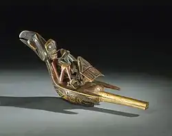 Native American people often use rattles in ceremonial dances. Oftentimes, these rattles are meant to represent something. Each figure or depiction can relate to something sacred to their tribe.[5] Often, the sound of rattles forms a connection to the supernatural world when the rattles are employed by shamans. The use of the raven rattle, like the one pictured to the right, always implies power, which when used in dances, symbolize the status of the chief, who has a hereditary right to use the rattle.[6]