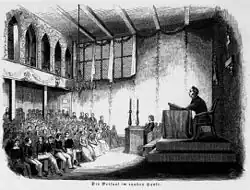Rauhes Haus was founded at Horn (now a suburb of Hamburg) by the 25-year-old theologian Johann Hinrich Wichern on 12 September 1833 who for a long time was head administrator at the institution. The name of the institution is a corruption of Ruges Haus as the institution started in an old house called by its former occupant Ruges Hus (i.e. Ruge's house), which by a mistranslation into high German became “Rauhes Haus”, i.e. rough house. It was connected with the German Home Mission (or Inner Mission), and started as an industrial institution for poor boys. The scope of the school widened with its growth, and in the early 20th century, besides forming a refuge for neglected children, it received boarding pupils from the higher income families and served as a training school for those wishing to become teachers, superintendents or assistants in hospitals, reformatories, houses of correction and the like. It was supported by voluntary contributions, profits arising from the productive enterprises it carried on, and fees from the richer pupils.