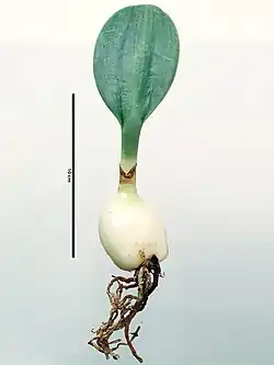Rauhia are bulbous,[3] perennial plants[4] with annual,[8] ovate to oblong, fleshy, petiolate, glaucous leaves[9] and large,[8] solitary, tunicate, underground bulbs.[4]