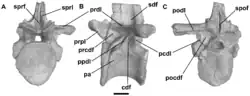 Nesbitt later erected another clade, "Group Y", in 2007.[19] Group Y falls within Group X to include Sillosuchus, Shuvosaurus, and Effigia. Group Y is diagnosed by the presence of four or more sacral vertebrae with fully fused neural arches, which is also seen in theropod dinosaurs (a case of evolutionary convergence). In addition, the cervical vertebrae that make up the neck are strongly amphicoelus, meaning that they are concave at both ends. The fourth trochanter, a ridge of bone on the femur for muscle attachment seen in nearly all archosaurs, is absent in Group Y.[19] "Group Y" is now termed Shuvosauridae.[2]