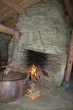 The Raudsjø Valley lies high in the mountains, at an elevation of 900 meters (3,000 ft),[7] and is difficult to access. Construction began on June 12, 1856. A team of 37 workers and 38 horses stayed for three weeks to build the large stone dairy building.[2][8] In addition, the dairy was equipped with a barn that could accommodate 100 cattle.[2][3] In addition to a cheese-making room with an open hearth, the dairy building also had a milk house and a storage room for the finished cheese (an Emmental cheese).[3]