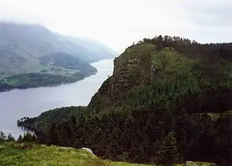 The highest point is an outcrop of rock with a small cairn, partially screened by conifers. The view from the summit is limited by the trees, but the eastward panorama opens up from the brink of the crag itself and there is an aerial view of the Thirlmere dam. The reservoir is also seen end on to the south. The Benn and Castle Crag provide a close-up view of Raven Crag from the north.[2][3]