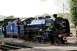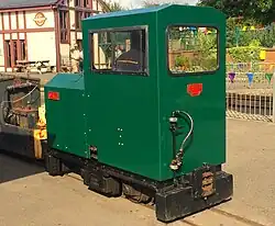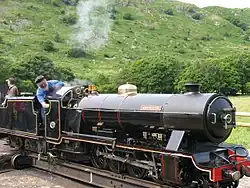 In December 1929, a 4 ft 8+1⁄2 in (1,435 mm) standard gauge 0-6-0 diesel locomotive was obtained to work the Ravenglass-Murthwaite section. It was built by Kerr Stuart (works number 4421) and had a six-cylinder, 90 horsepower (67 kW), McLaren-Benz engine. Transmission was mechanical and final drive was by roller chains. In 1955 it was sold, through a dealer, to the National Coal Board for use at Wingate Grange Colliery, Durham. A new Dorman engine of 90 horsepower (67 kW) was fitted in 1960.[13] It is now preserved at the Foxfield Light Railway,[14] restored to original external condition, and was displayed at Ravenglass in the summer of 2000.