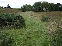 The Ravenscraig Quarry (55°41′42″N 4°40′06″W / 55.695026°N 4.668213°W) to Jameston Quarry (55°41′02″N 4°40′42″W / 55.683808°N 4.678430°W) line was a 'Bogey Line' using 'bogeys' or small waggons that transported freestone (sandstone) to another freestone quarry at Jameston near Auchenskeith for transfer into standard gauge waggons and onward transport via the standard gauge Glasgow and South-Western Railway's Dalry to Kilmarnock line.[1] Probably mainly worked by gravity, manually and by horses, the width of the fairly substantial surviving embankments and some vague cuttings suggests that it was a narrow gauge rather than a standard gauge line. The Ordnance Survey maps of the time show that it existed after 1856 and was abandoned by 1895. Jameston Quarry was also disused by 1895 and has since been infilled.[1][2] Old maps show that prior to the railways construction stone could be taken away via North Lissens farm or across the Gorbie Glen and away via Asseyfaulds Cottage.