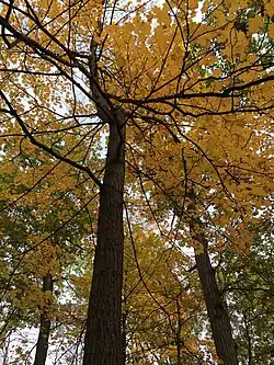 The forest cover of Ravine Park is dominated by a mixture of sugar maples, basswood, and red oaks. Various other species, including the highly invasive Norway maple, also account for some of the biomass. The undergrowth is dominated by plants such as Virginia bluebells, mayapple, and trillium. The American witch-hazel is also present in small quantities.[9]