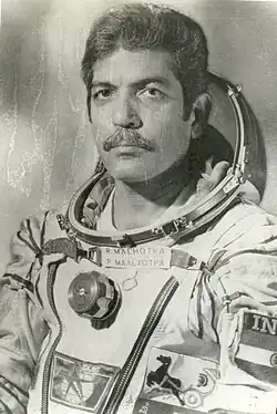 In 1982, he was chosen to train for spaceflight in the Soviet Union's Intercosmos program. Malhotra served as backup for Rakesh Sharma on the Soyuz T-11 mission to Salyut 7 space station which launched the first Indian into space, but never went to space himself. Malhotra was awarded the Soviet Order of Friendship of Peoples[1] in 1984 and the Kirti Chakra in 1985.[2]