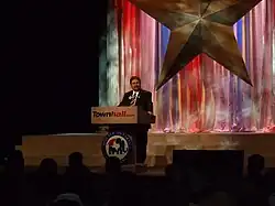 Along with his mother, he gave complimentary blood pressure checks at a booth at the Fort Worth Convention Center during the straw poll, and addressed the delegates during the main session prior to voting along with candidates Rep. Duncan L. Hunter of California, Rep. Ron Paul of Texas, Alabama psychiatrist Hugh Cort, and Illinois lawyer John H. Cox.[3]