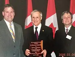 ![]() Desjardins (centre) receiving an award from the Canadian government, by John Baird to the left, for his work for the IPPC | |