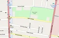 Raymond Park is roughly rectangular in shape and bounded by Main Street to the west, Wellington Street to the east, and Baines Street to the south, and Sinclair Street in part to the north. The irregularity in shape is due to the presence of the Pineapple Hotel in the south-west corner and housing at other locations, presumably existing prior to the establishment of the park. Note Baines Street is named after Edward Joseph Baines, a mayor of Brisbane who was the publican of the Pineapple Hotel.