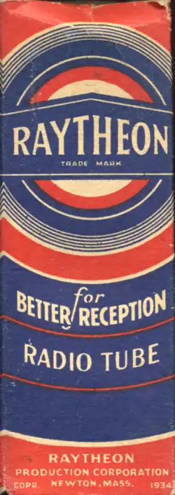 In 1922, Vannevar Bush, scientist and professor in the Department of Electrical Engineering at the Massachusetts Institute of Technology (MIT), along with engineer and physicist Laurence K. Marshall, and scientist Charles G. Smith, founded the American Appliance Company in Cambridge, Massachusetts.[9] Its focus, which was originally on new refrigeration technology, soon shifted to electronics. The company's first product was a gaseous (helium) voltage-regulator tube that was based on Charles Smith's earlier astronomical research of the star Zeta Puppis.[10] The electron tube was christened with the name Raytheon (a compound of Old French and Greek meaning 'light from the gods')[11] and was used in a battery eliminator, a type of radio-receiver power supply that plugged into the power grid in place of large batteries. This made it possible to convert household alternating current to a regulated, high voltage direct current for radios and thus eliminate the need for expensive, short-lived batteries.