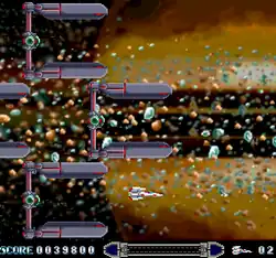The title employs a checkpoint system in which a downed player will start off at the beginning of the checkpoint they managed to reach before dying.[2] Getting hit by enemy fire or colliding against solid stage obstacles will result in losing a life, as well as a penalty of decreasing the ship's firepower and loss of the weapon that was currently in use, and the game is over once all lives are lost, though the player has unlimited continues to keep playing.[3]