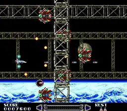 As with the original Rayxanber, the title employs a checkpoint system in which a downed player will start off at the beginning of the checkpoint they managed to reach before dying.[4][5] Getting hit by enemy fire or colliding against solid stage obstacles will result in losing a live, as well as a penalty of decreasing the ship's firepower and loss of the weapon that was currently in use, and the game is over once all lives are lost, though the player has unlimited continues to keep playing.[7]