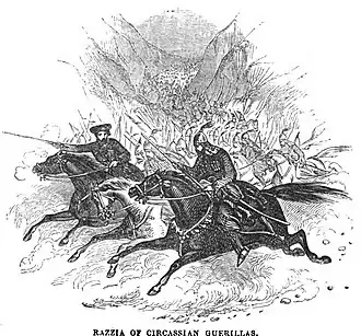 The word is from Italian razzia 'incursion', and from Algerian Arabic ġaziya (غزية), "algara" or 'raid'. Ghazwah (plural ghazawat) (Arabic: غزوة) is an originally Arabic term meaning "invasion".[1] It comes from the triconsonantal root g.z.w. ("to attack"). It has the same connotation as the words ghaziya and maghazi, which in pre-Islamic times referred to raids organized by nomadic Bedouin warriors for the purpose of plundering rival tribes or sedentary, wealthier neighbors.[2] The plural ghazawat is used in some Islamic countries as a synonym for "judgment".[2]