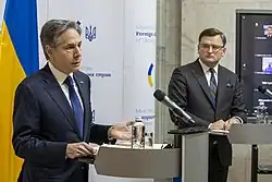 In an interview with the French newspaper Libération in April 2021, Ukrainian Foreign Minister Dmytro Kuleba said that provocations by Russia with the relocation of troops to the border with Ukraine and the aggravation of the situation in the east are the most serious since the attack on Ukrainian sailors in the Kerch Strait in November 2018. At the same time, the current threat from Russia was more dangerous.[1] In an interview with the Spanish news agency EFE, Kuleba said that Ukraine did not want a war with Russia and was not preparing for any escalation in Donbas at the time. In particular, it was not preparing any offensives or military operations.[2] During renewed tensions in January 2022, Kuleba stated that any reckless step of the Russian Federation or a new round of violence on its part would cost it dearly.[3] Kuleba said that Russia continued to increase its military presence along the Ukrainian-Russian border, in the occupied territories and in the seas of Ukraine. According to him, Russia was gathering troops in three directions, including in the northeast of Ukraine; in Crimea, in the south; and in the Donbas, in the east. Kuleba also added that in recent weeks, Russia had significantly intensified its propaganda, which dehumanizes Ukrainians and sows hatred for Ukraine.[4] On 22 January 2022, Kuleba accused Germany of "undermining" unity among the country's allies and of "encouraging" Russian President Putin to attack Ukraine by refusing to deliver weapons to Ukraine.[5]