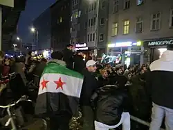 Syrian refugees in Paris, London, Stockholm, Helsinki and Athens took part in public celebrations.[28] Thousands of Syrians in Berlin, Germany, congregated along streets to celebrate the overthrow. In Neukölln, celebrators brought out the flag of the Syrian opposition and marched to Kreuzberg.[38]