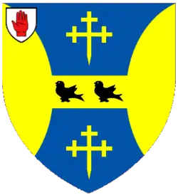 Azure on a fess between two cross crosslets fitchee Or as many martlets Sable all within two flaunches of the second.