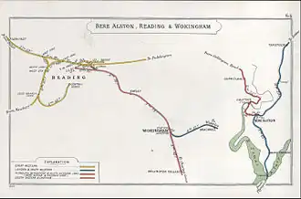 Since 1903 the Southern Railway and its constituents had pursued a policy of electrification, which began with the routes closest to the London termini and gradually worked outwards.[33] On the LSWR's Waterloo to Reading Line, electric trains had reached Wandsworth Town on 25 October 1915 and Twickenham on 30 January 1916; Hounslow was reached (the Hounslow Loop Line) on 12 March 1916.[34] The policy was continued by the Southern Railway from 1923,[35] and on 6 July 1930, electrification was extended to Windsor, which included the Reading line as far as Staines.[36] Electric trains reached Virginia Water on 3 January 1937,[37] and in that year, several electrification schemes were proposed by the Southern Railway, which included the route from Virginia Water to Reading.[38] As part of these works, new berthing sidings were provided at Reading.[39] The electric service from Waterloo to Reading was introduced on 1 January 1939;[40][41][39] trains were every 20 minutes at peak times and every 30 minutes off-peak and on Sundays.[40][41] Most trains ran non-stop between Waterloo and Staines,[41] and on the outward journey they divided at Ascot (with one portion continuing to Guildford via Aldershot), whilst on the London-bound trip, the two portions would be combined again at Ascot.[40] The total journey time from Waterloo to Reading was reduced from 90 minutes to 75.[40][41]