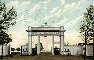 Originally the site of Camp Meigs and training grounds for the 54th Massachusetts Volunteer Infantry, in 1869 the Norfolk Agricultural Association purchased the land and built a half-mile track. Sold in 1895 to The New England Trotting Horse Breeders Association, the track was renamed the Readville Trotting Park and expanded to a full mile with the addition of a 3,400 seat grandstand, a clubhouse, restaurant, hotel and stable area. Railroad service was added by the New York, New Haven and Hartford Railroad to accommodate Boston, New York and Connecticut spectators.[1] By 1899 Grand Circuit harness drivers were competing for a record $10,000 purse. The New York Times proclaimed "The August 23rd race was, without question, one of the finest exhibitions ever seen on this or any other track...and the crowd was the biggest yet."[4]