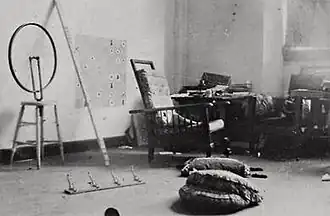 The readymades of Marcel Duchamp are ordinary manufactured objects that the artist selected and modified, as an antidote to what he called "retinal art".[1] By simply choosing the object (or objects) and repositioning or joining, titling and signing it, the found object became art.