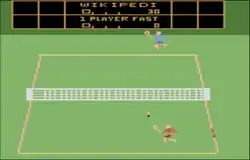 In the game, one player with a blue shirt plays tennis against an AI enemy portrayed by a non-player character (NPC) with a red shirt. In the two-player mode, one player competes against another player local. Players can move vertically and horizontally on the map. With the one button on the Atari 2600 controller, players make the serve.[7] Every further shot is automatic if the ball has physical contact with the player.[7] For every ball that falls on the opposing playing field, players get 15 points which they can see at the top part of the screen. After they reached 30 points, they only get 10 points for each other ball. After 40 points, they won one round. The number of rounds won goes up to 6. After winning 6 rounds, a new pile is opened at the top part of the screen which again goes up to 6. The first player who won two piles of 6 rounds wins the game.[7]