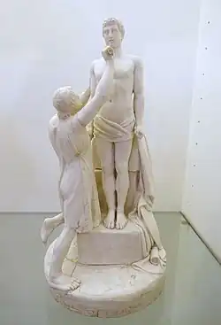 The room at the small Casita del Principe, El Escorial was again Neoclassical, but with a very different appearance. The walls were almost entirely covered by 234 plaques in the style and technique of Wedgwood's jasperware, with a "Wedgwood blue" ground and the design in white biscuit porcelain in low relief. These were applied as sprigs, meaning that they were made separately as thin pieces, and stuck to the main blue body before firing. The plaques are framed like paintings; they were made between 1790 and 1795.[3]