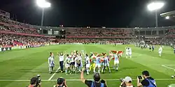 In February 2019, a Basque derby league fixture hosted by Real Sociedad against Athletic Bilbao, which would usually be held at the club's Zubieta training centre, was played at the Anoeta Stadium, attracting an attendance of 21,234 (the result was a 2–2 draw).[2] The following week, the same venue hosted a semi-final of the Copa de la Reina in which Real defeated Sevilla 3–1 in front of 18,731 fans to reach the final of the competition for the first time.[3] On 11 May 2019, the club achieved their first ever major trophy by beating Atlético Madrid 2–1 in the final of the Copa de la Reina, played in Granada.[4] The win granted entry to the newly-established Supercopa de España Femenina, but after overcoming Levante to reach its final, they suffered a humiliating 10–1 defeat to Barcelona.[5] Their first UEFA Women's Champions League tie, after finishing second behind Barcelona in the 2021–22 Primera División, was against FC Bayern of Germany[6] and ended in elimination by a 4–1 aggregate score (Synne Jensen had the distinction of scoring the first European goal). Another Copa de la Reina final was reached in 2024, but this resulted in another heavy loss (8–0) to Barcelona.[7]
