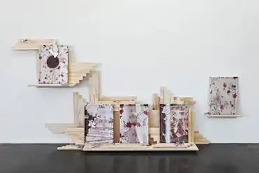 Beginning in 2010, Bollinger increasingly translated two-dimensional images and ephemeral experiences into three-dimensional space and physical objects (e.g., Background, 2010).[13] Using photography as a structural base to extract shapes and abstractions, she produced works such as Color Study (2010), which combined a single photograph with glazed ceramic elements.[12][14] In later sculpture, installations and performances, she aggregated materials and objects—found ephemera, her own hand built ceramics, cast glass, bronze and poured aluminum elements, imprinted cork boards, and writing—much as earlier work aggregated images (e.g., Darling Dark Direct Directly, 2018).[15][16][17]