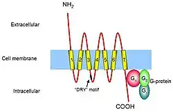![]() Typical structure of a chemokine receptor, with seven transmembrane helices and a characteristic "DRY" motif | |