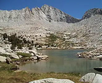 Recess Peak is a 12,813-foot-elevation (3,905-meter) mountain summit located west of the crest of the Sierra Nevada mountain range in Fresno County of northern California, United States.[3] It is situated on Mono Divide in the John Muir Wilderness, on land managed by Sierra National Forest, and approximately six miles east of Lake Thomas A Edison. The nearest higher neighbor is Mount Hilgard, 2.2 miles (3.5 km) to the southeast.[1] The John Muir Trail follows Bear Creek below the western slope of this remote peak. The summit is surrounded by arêtes and cirques, which were formed by glaciers in the past, most recently ending 13,000 years ago in the late Pleistocene.[4]