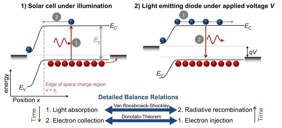 The Donolato theorem is based on the principle of detailed balance and connects the processes of charge carrier injection (relevant in the luminescent mode of operation) and charge carrier extraction (relevant in the photovoltaic mode of operation). In addition, the detailed balance between absorption of photons and radiative recombination can be mathematically expressed using the van Roosbroeck–Shockley[3] equation as