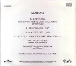 "Reckless" is a song written by Michael Clark and Jeff Stevens, and recorded by American country music group Alabama. It was released in August 1993 as the first single from their album, Cheap Seats. The song was their final number one the Billboard Hot Country Singles & Tracks (now Hot Country Songs) chart until June 2011, when they reached the number one position again with a guest vocal on Brad Paisley's "Old Alabama".