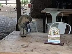 Some vervet monkeys in the Caribbean, particularly teenaged individuals, exhibit a preference for alcoholic beverages over non-alcoholic ones, a taste which likely developed due to the availability of fermented sugar cane juice from local plantations.[9] On Saint Kitts, these monkeys often raid bars and tourist beaches for alcoholic drinks, and become visibly inebriated. The proportions of the monkey population that do not drink, that drink in moderation, and that drink to excess mirror those proportions in humans.[10]