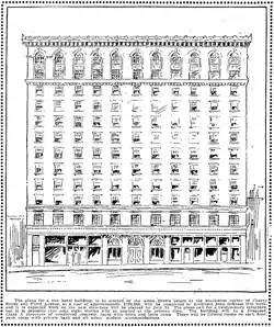 In 1911, Brown's estate under the direction of his son Alson L. Brown commissioned architect John Graham, Sr. (whose offices were located in the recently completed Lyon Building next door) to design a fireproof hotel building for their lot. They had Graham make plans for both an 8-floor and 12-floor design that they would decide upon if the bids for the larger design met their budget or not. Graham's design was for a 3-part Beaux-Arts tower faced with limestone, brick and terra cotta over a reinforced concrete structure.[9] They ultimately opted for the 12-floor design, costing an estimated $200,000, but chose to only complete the first 6 floors for the time being. Graham's concept sketch was published in the July 9, 1911 edition of the Seattle Times, showing the building as it would have been with the top 2 floors forming the capital of the 3-part design with arched windows and a large dentiled cornice.[10] Demolition of the old buildings by contractor Sherman G. Combs[8] began in July 1911[7] and excavation of the lot was completed by the end of August.[11] Harry Brandt was awarded the general contract[12] and the building's steel and concrete structure was finished by the end of the year.[13] Although the building was completed by early 1912, the hotel itself wouldn't open for another year; the reason for this delay was never made clear. The Hotel Rector, operated by the Levinson Hotel Company, Inc., officially opened on May 5, 1913, touting its fireproof building and the fact that it was completely furnished by Seattle labor. Doc Humphrey, previously of the Frye Hotel, was its first manager.[14] A large neon sign spanning the building's top 5 floors could be seen up and down Cherry Street.