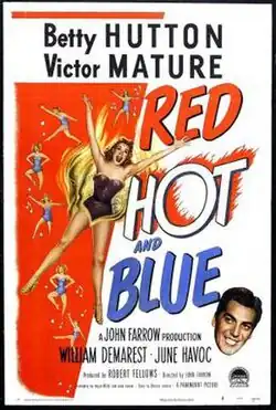 Red, Hot and Blue is a 1949 American musical comedy film directed by John Farrow and starring Betty Hutton, Victor Mature, William Demarest and June Havoc. It was released by Paramount Pictures. Hutton plays an actress who gets mixed up with gangsters and murder. Frank Loesser wrote the songs and plays a key role. The film has no connection to Cole Porter's play of the same name.